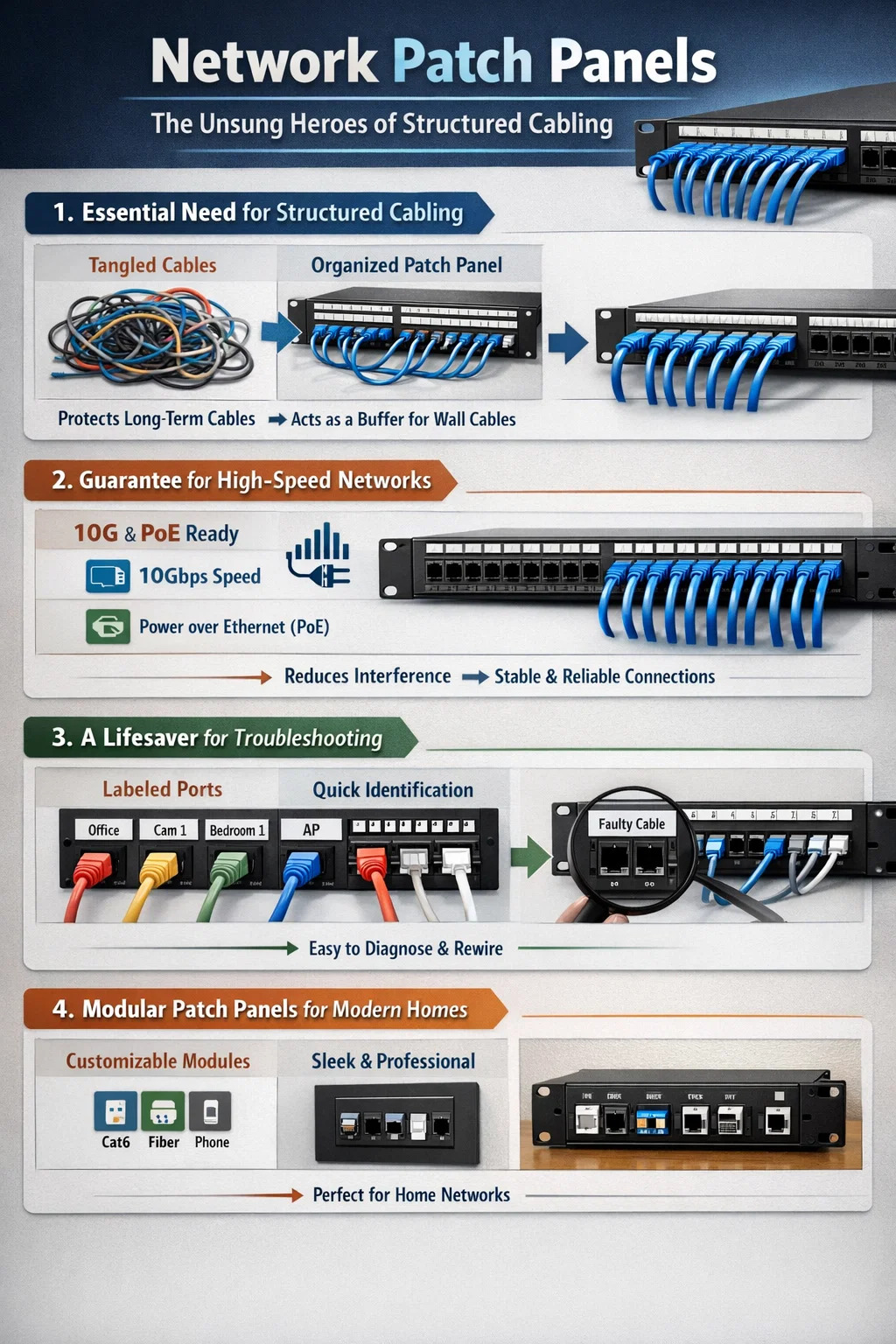 Perlindungan lapisan fisik: Kabel jaringan di dalam dinding biasanya kaku. Jika dicolokkan langsung ke sakelar, seringnya mencolokkan dan mencabut serta pergerakan dapat menyebabkan inti kabel putus. Panel patch bertindak sebagai buffer; itu tetap diam, dan Anda hanya memindahkan kabel patch pendek di luar, melindungi kabel panjang yang mahal di dalam dinding.