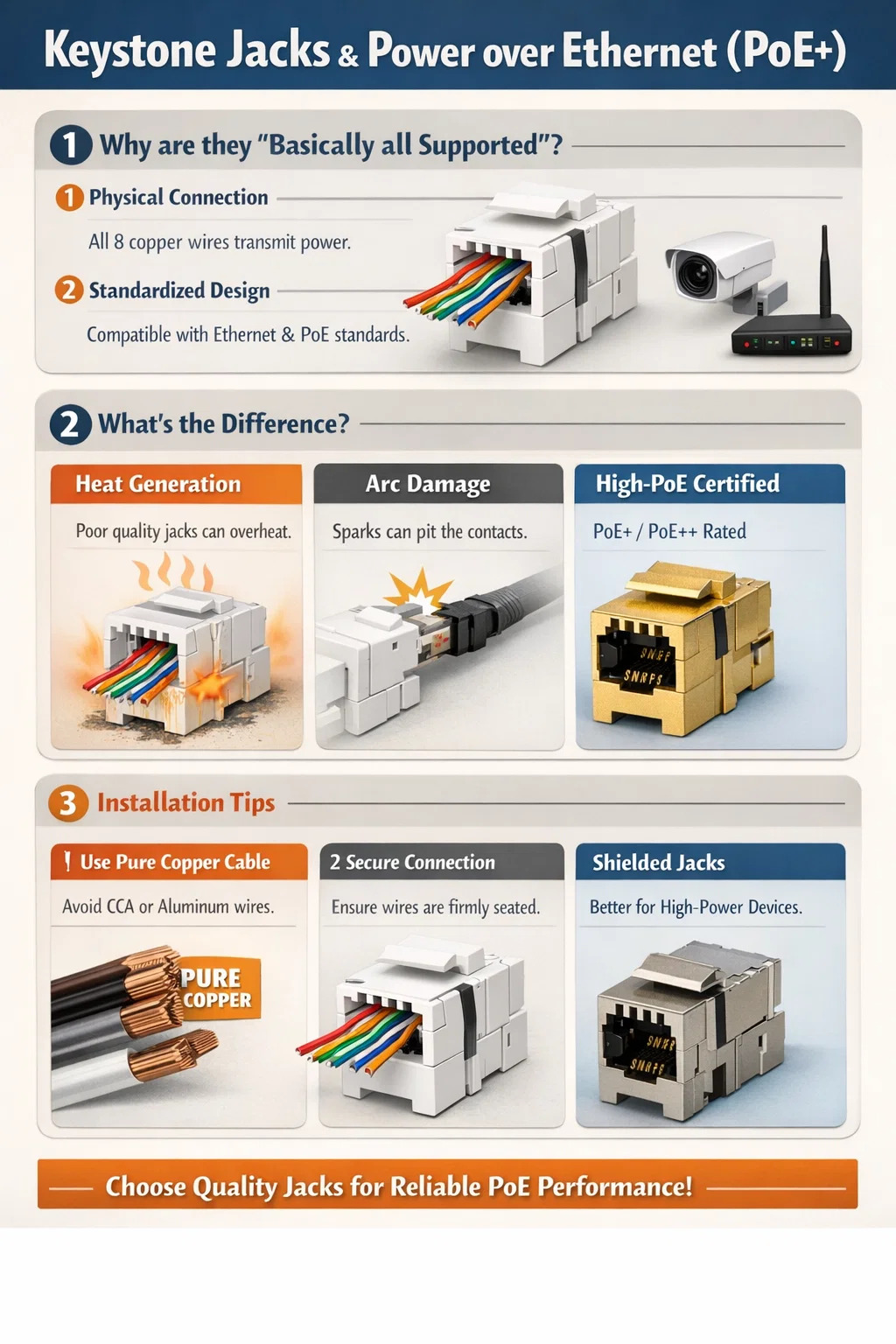 Anda dapat menganggap Keystone Jack sebagai "kabel ekstensi"; selama terhubung menggunakan konfigurasi standar 8 kabel, arus dapat mengalir melaluinya. Namun, saat menangani perangkat berdaya lebih tinggi, ada beberapa detail yang perlu dipertimbangkan: