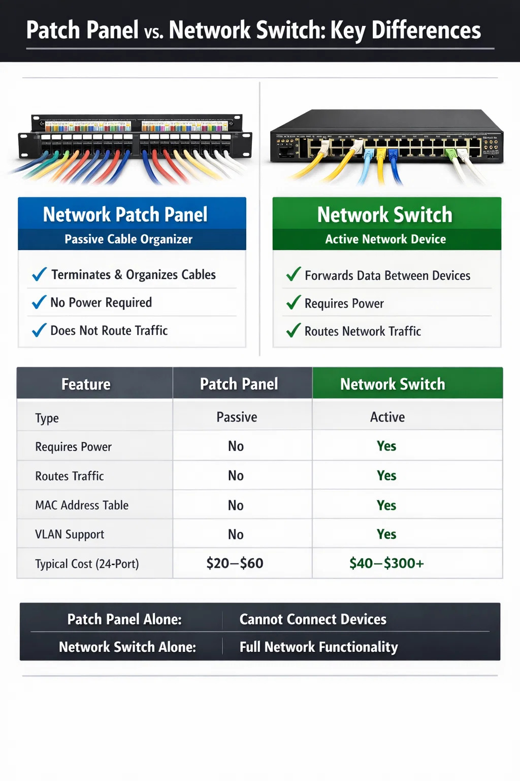 A panel patch jaringan adalah alat organisasi untuk pemasangan kabel terstruktur. Ini sepenuhnya pasif, tidak memerlukan daya, dan tidak menyediakan fungsionalitas jaringan dengan sendirinya. Sakelar jaringan adalah otak aktif dari jaringan kabel Anda — tanpanya, tidak ada yang berkomunikasi. Anda memerlukan saklar terlepas dari apakah Anda menggunakan panel patch.