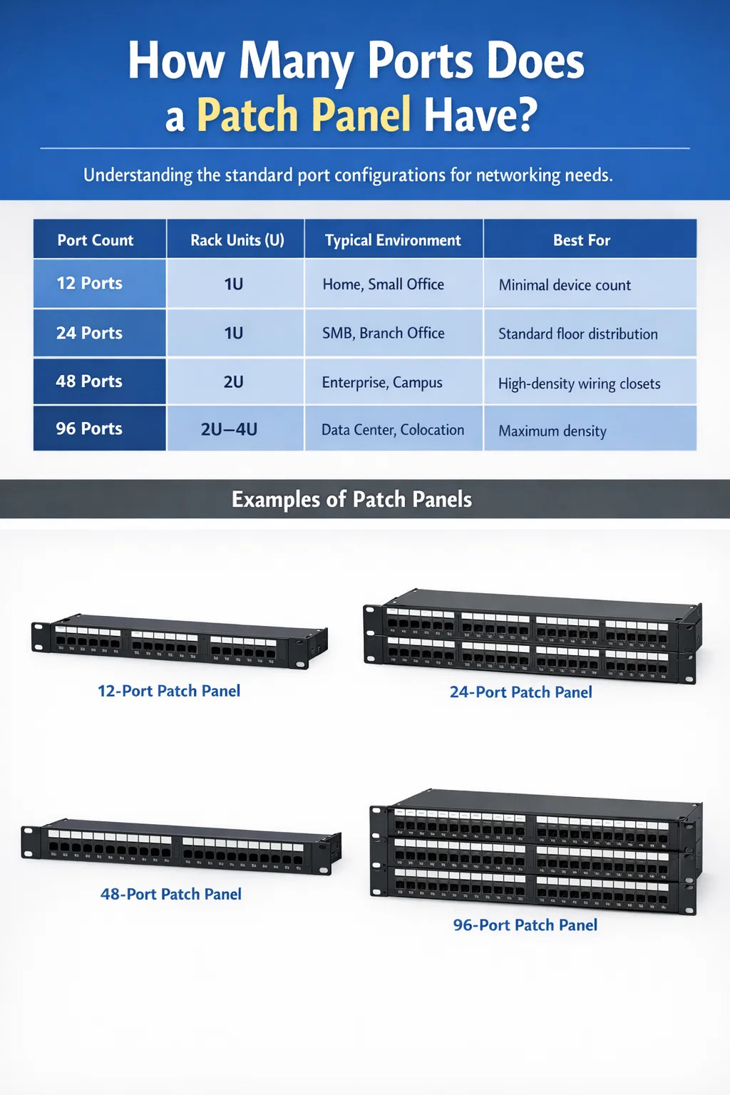 SEBUAH panel patch jaringan biasanya masuk 12, 24, 48, atau 96 port , dengan model 24-pelabuhan dan 48-pelabuhan menjadi yang paling banyak digunakan di lingkungan komersial dan perusahaan. Panel patch 24 port cocok 1U ruang rak , sedangkan versi 48-port menempati 2U . Panel 12 port yang lebih kecil umum digunakan di rumah atau lemari telekomunikasi kompak, dan panel 96 port berdensitas tinggi dapat ditemukan di pusat data besar yang ruang raknya sangat mahal.
