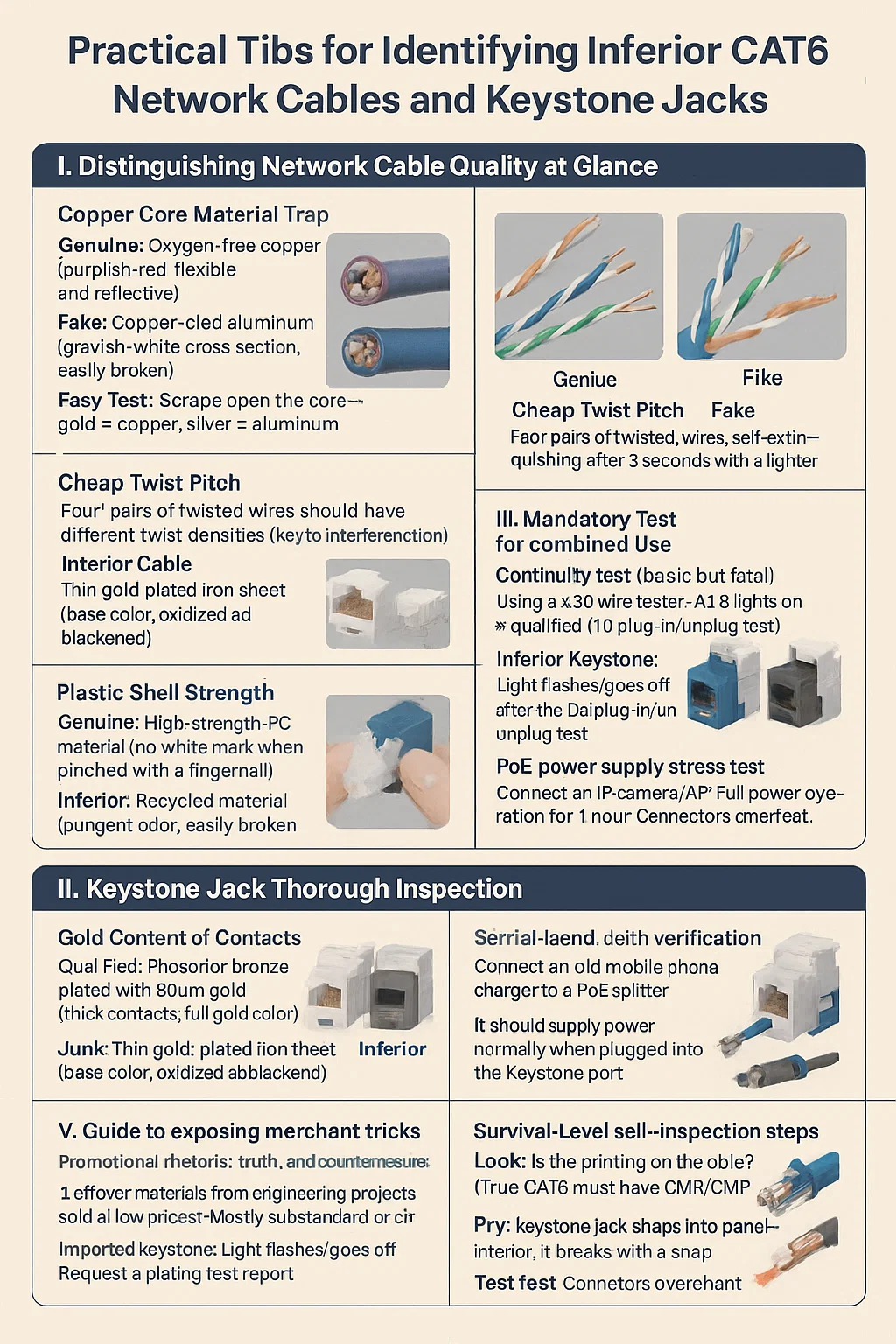 • Lihat: Apakah hasil cetak pada kabel jelas? (CAT6 sejati harus memiliki tanda peringkat api CMR/CMP.)