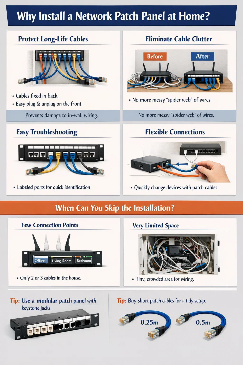 Jika Anda memiliki kabel yang mengalir ke setiap ruangan di rumah Anda, mungkin ada 5 hingga 10 kabel jaringan di dalam kotak bertegangan rendah. Menyambungkannya langsung ke router akan menghasilkan kabel yang kusut, sehingga pintu lemari tidak dapat ditutup. Dengan panel patch, semua kabel tersusun rapi dalam satu baris, setiap port diberi nomor, yang secara visual menyenangkan.