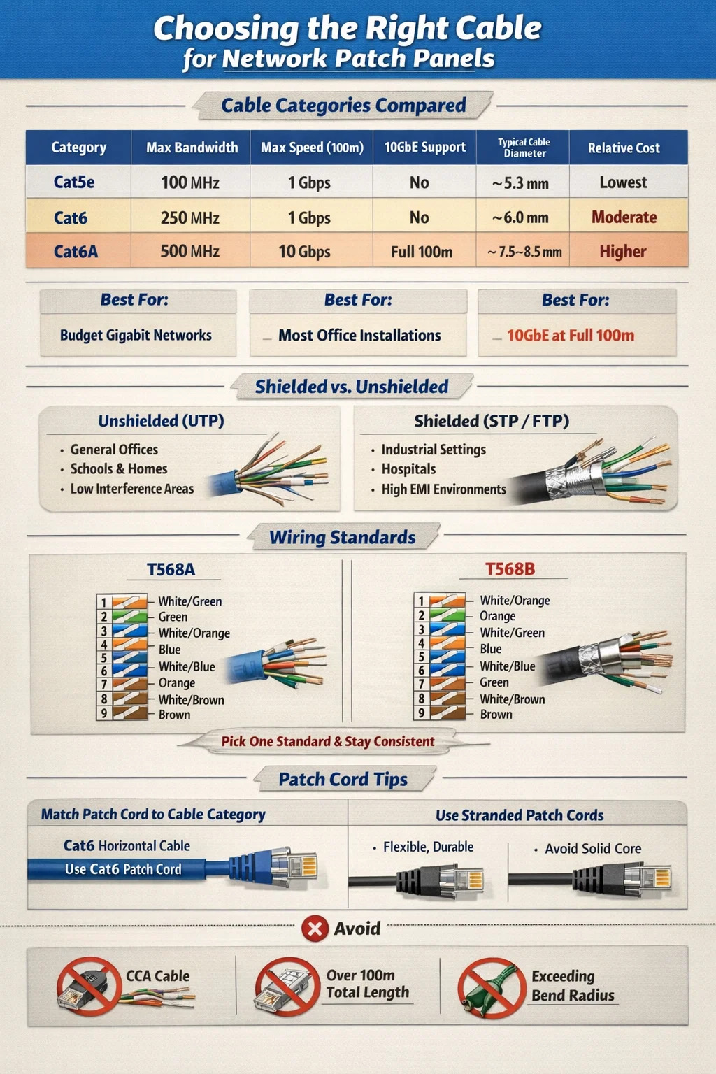 Baik T568A maupun T568B merupakan standar pengkabelan TIA/EIA yang valid untuk mengakhiri kabel Ethernet pada port punch-down panel patch. Perbedaan performa teknis antara keduanya dapat diabaikan — keduanya mendukung kecepatan dan jarak yang sama. Aturan pentingnya adalah konsistensi: gunakan standar yang sama di seluruh instalasi .