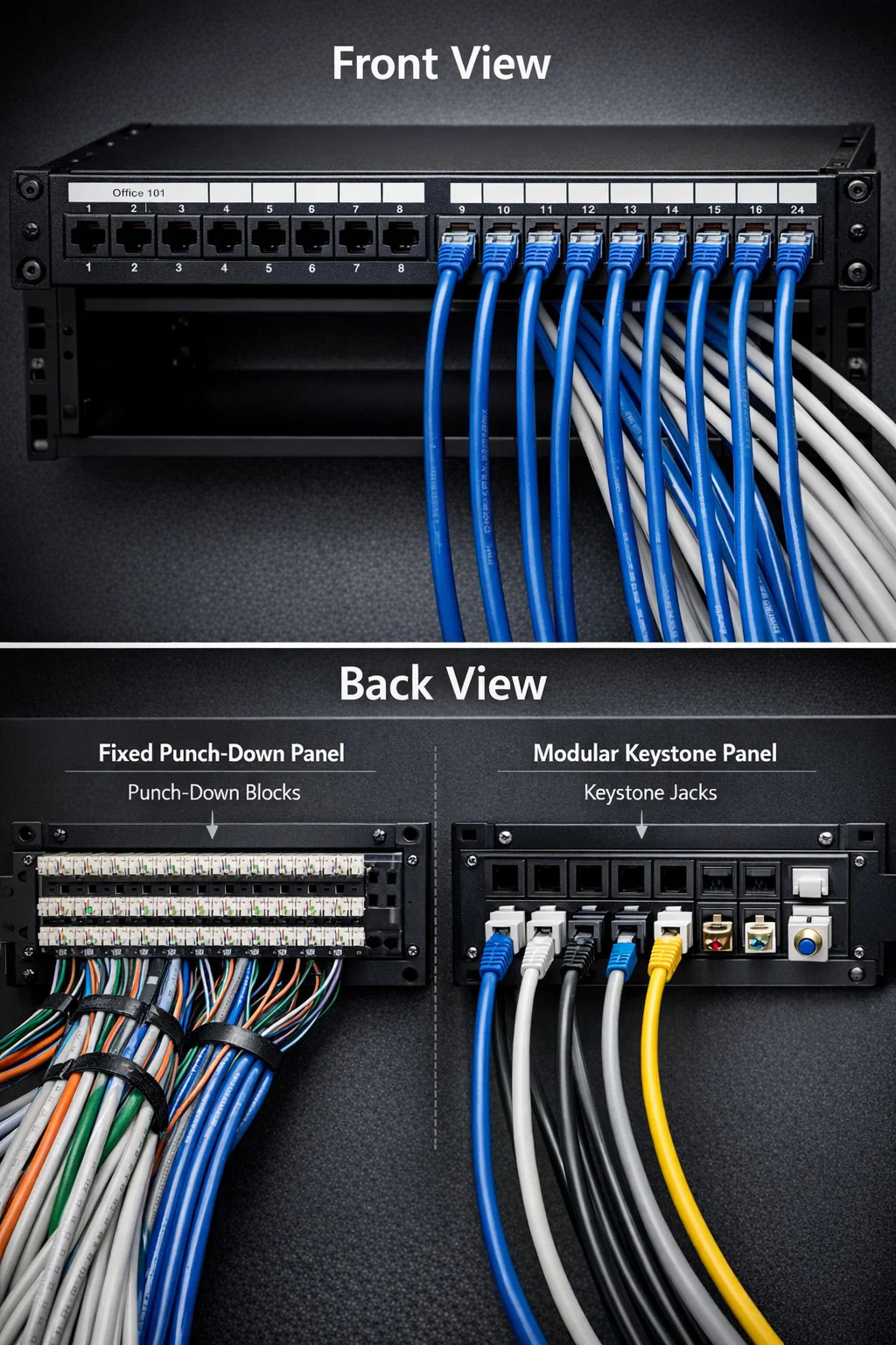 Saat terpasang sepenuhnya, Anda akan melihat rangkaian kabel masuk ke bagian belakang, yang diikat rapi atau diatur dengan velcro. Di depan, kabel patch pendek (biasanya panjangnya 0,5 kaki hingga 3 kaki) menjembatani kesenjangan antara panel dan saklar jaringan. Hal ini menciptakan tampilan "tambalan" vertikal yang bersih yang mencegah kekacauan "spaghetti" kusut yang sering ditemukan pada pengaturan amatir.