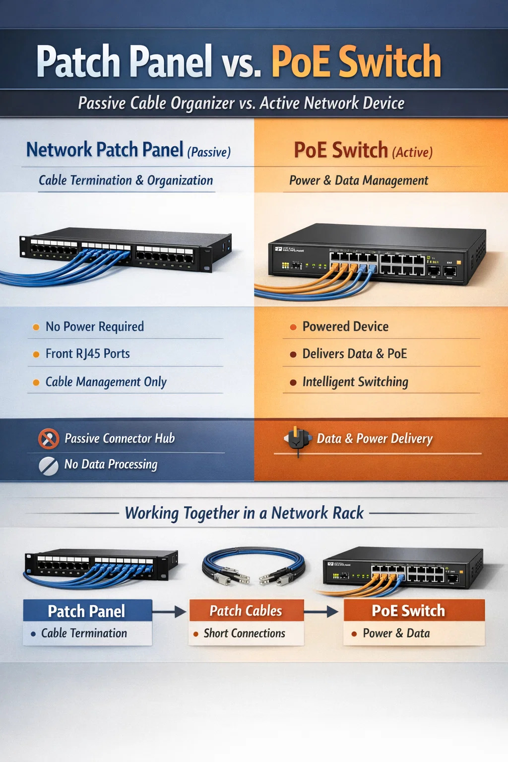 Perbedaan utamanya terletak pada sifat dasarnya: a panel patch jaringan adalah komponen perangkat keras pasif yang digunakan untuk organisasi dan terminasi kabel, sedangkan a saklar PoE adalah perangkat elektronik aktif yang mengatur lalu lintas data dan menyalurkan daya listrik melalui kabel Ethernet. Panel patch tidak memerlukan listrik dan tidak dapat memproses data; saklar PoE memerlukan sumber listrik dan bertindak sebagai "otak" dari jaringan lokal.