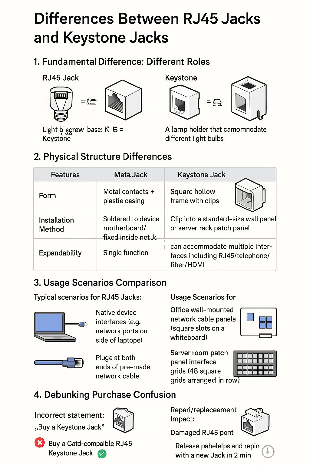 Analoginya: RJ45 = alas sekrup bola lampu; Keystone = dudukan lampu yang dapat menampung bola lampu berbeda.