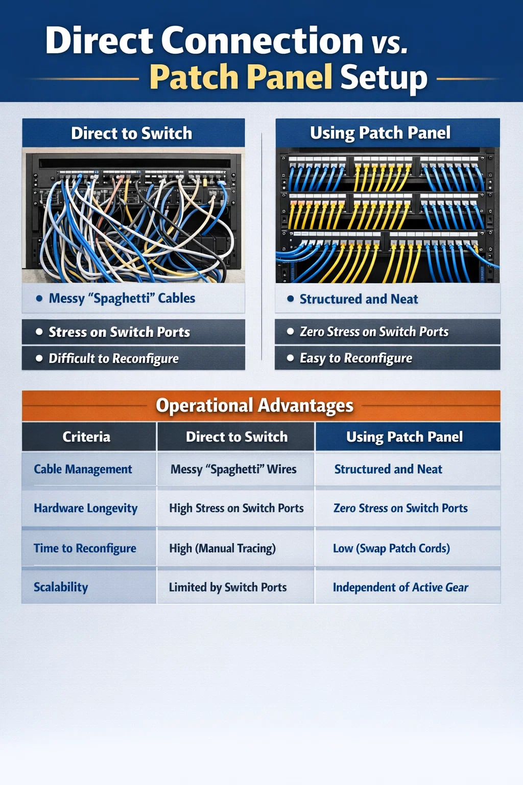 | Saatnya Mengonfigurasi Ulang | Tinggi (menelusuri kabel secara manual) | Rendah (pindahkan kabel patch 1 kaki) |